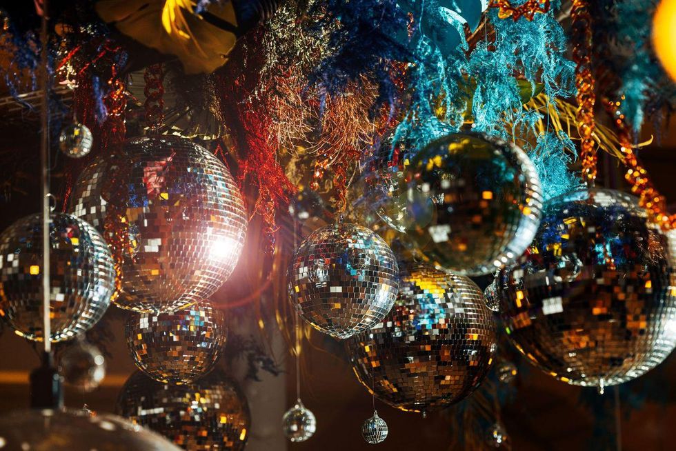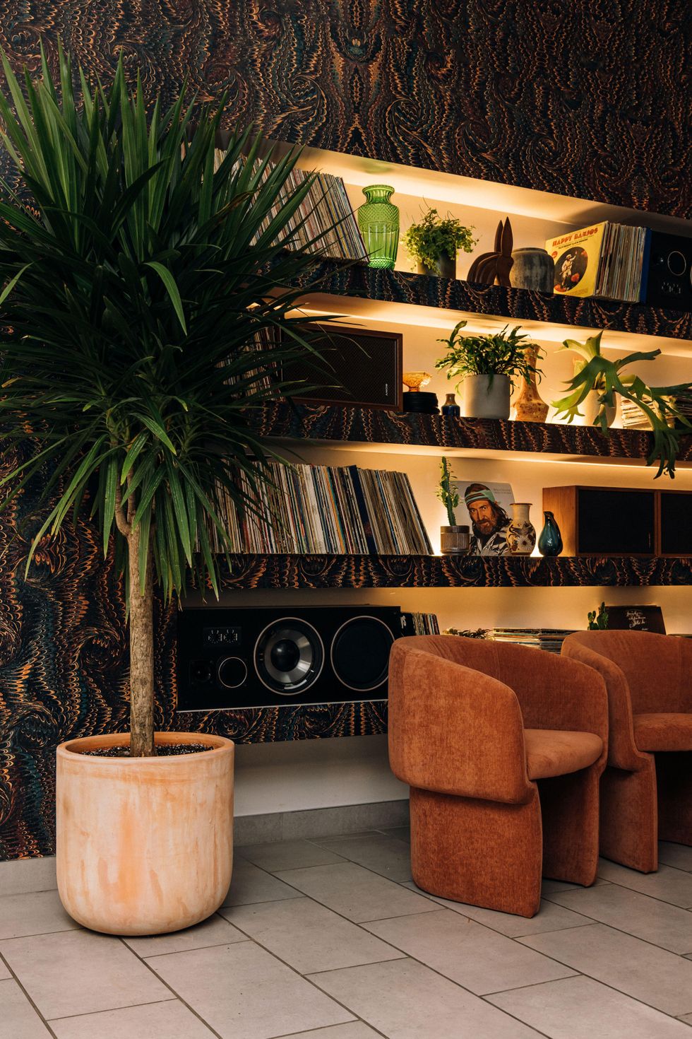 The space comes with upbeat vibes and funky decor including a sparkling disco ball ceiling and wall full of vinyl records you can sit and listen to.