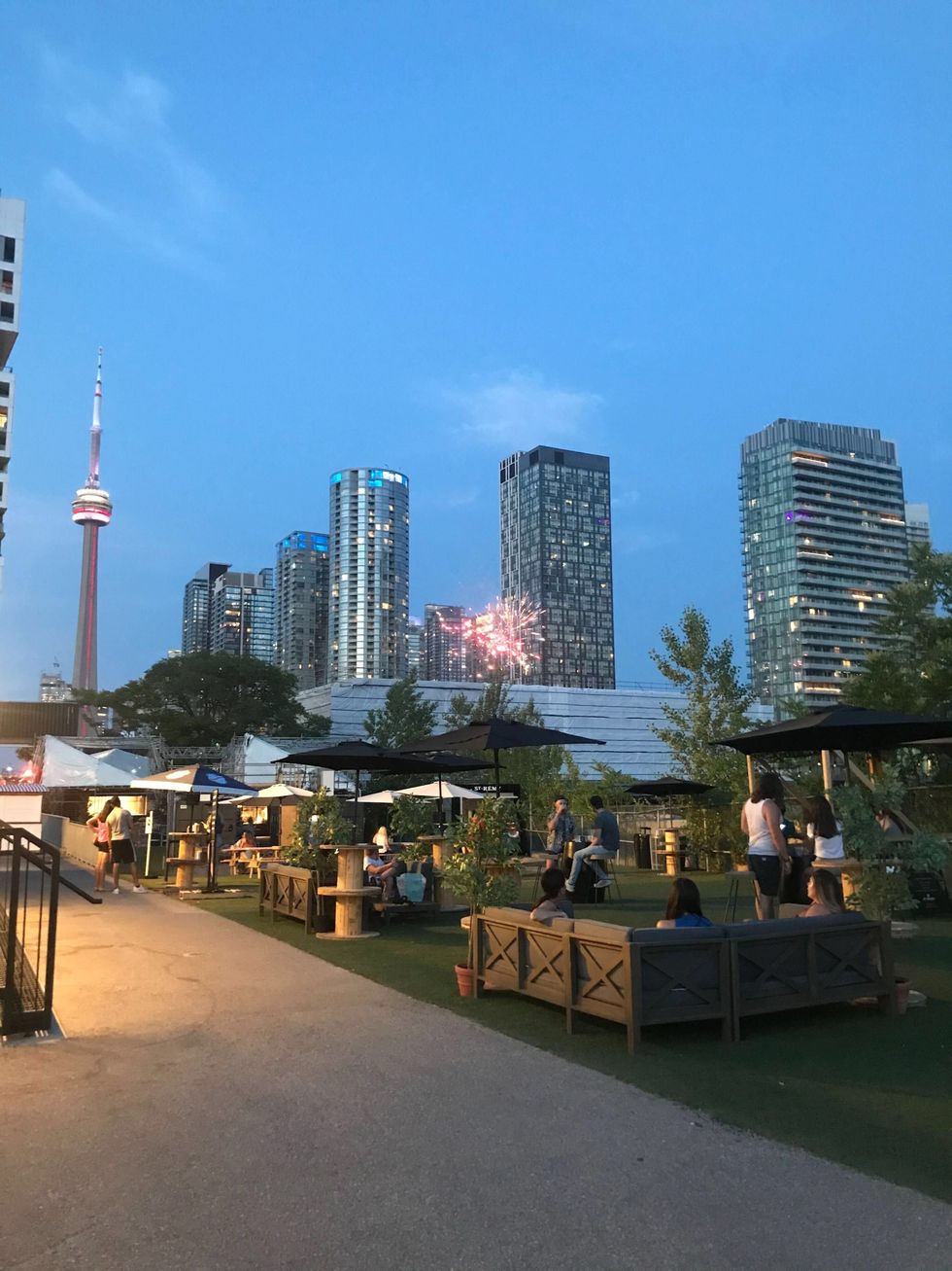The patio boasts a mix of comfy loungers, cabanas, picnic tables, and high-top barrels. You can indulge in a drink while taking in views of the city and CN Tower.