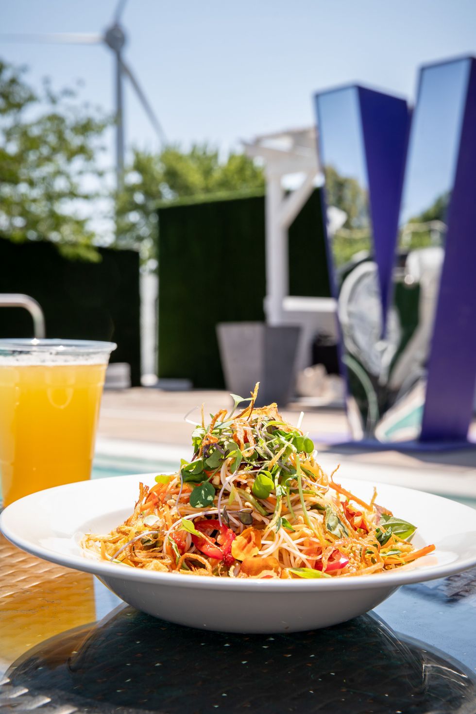 You can lounge on luxurious patio seats, splash in the pools, and enjoy vegan brunch, supper, and drinks at the city's largest poolside patio.
