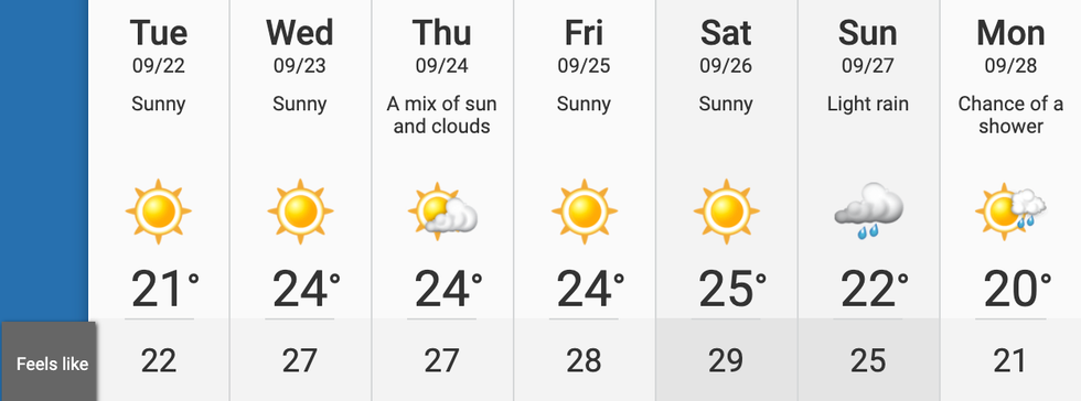 Saturday will likely be the hottest point during the week with a high of 25 C, feeling like 29 C. Friday will be a close second at 24 C, feeling like 28 C.