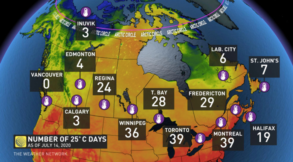 According to The Weather Network, Toronto is currently on track to record a whopping 20 days above 30 C this year.