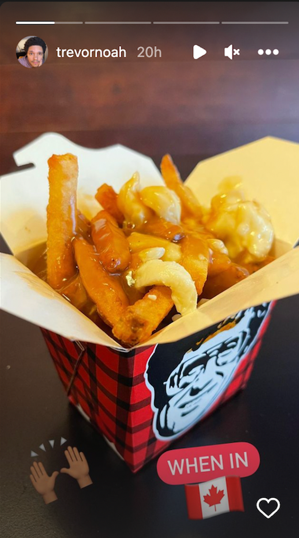 On Saturday, October 1, the South African comedian shared a picture of some tasty-looking poutine from Smoke’s Poutinerie on his story.