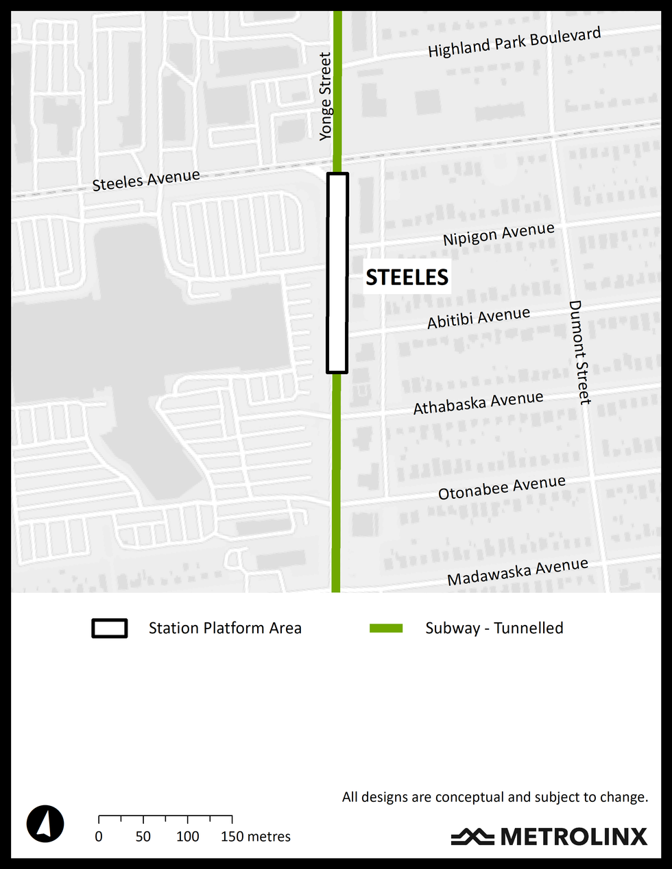 Steeles Station will be the "transit hub for the southern part of the Yonge North Subway Extension" and will sit near Yonge Street and Steeles Avenue.