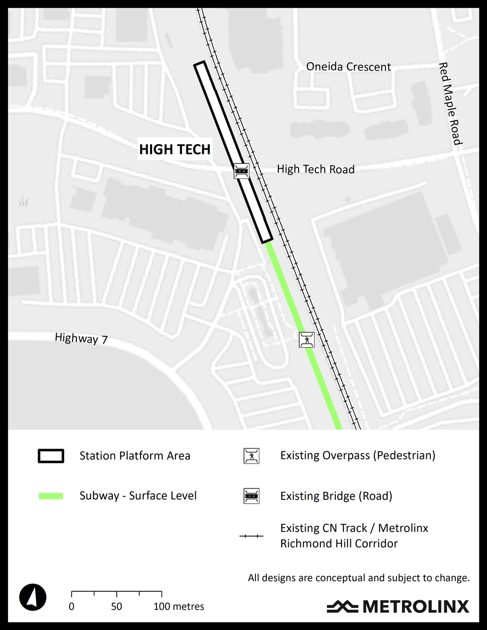 High Tech Station is the fourth and final approved station. It will be built underneath the "bridge along High Tech Road that spans the CN Railway corridor" in Richmond Hill and will offer "1,200 daily transfers to and from buses."