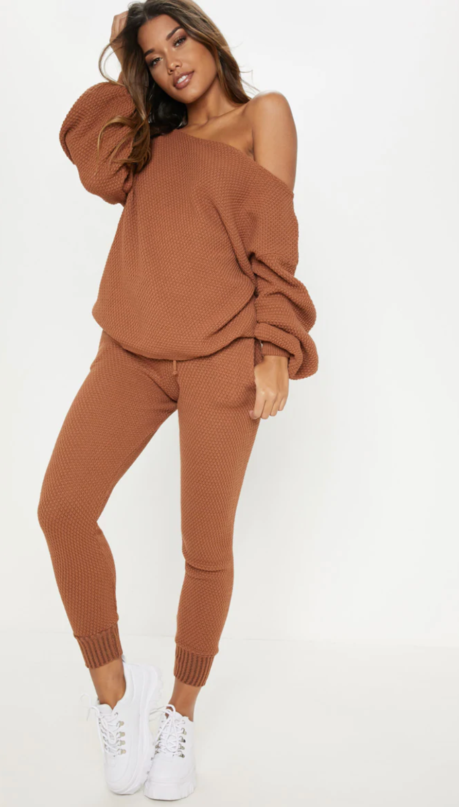 Details: You can lounge around at home or go out sporting that off-duty model look in this pink knit set.