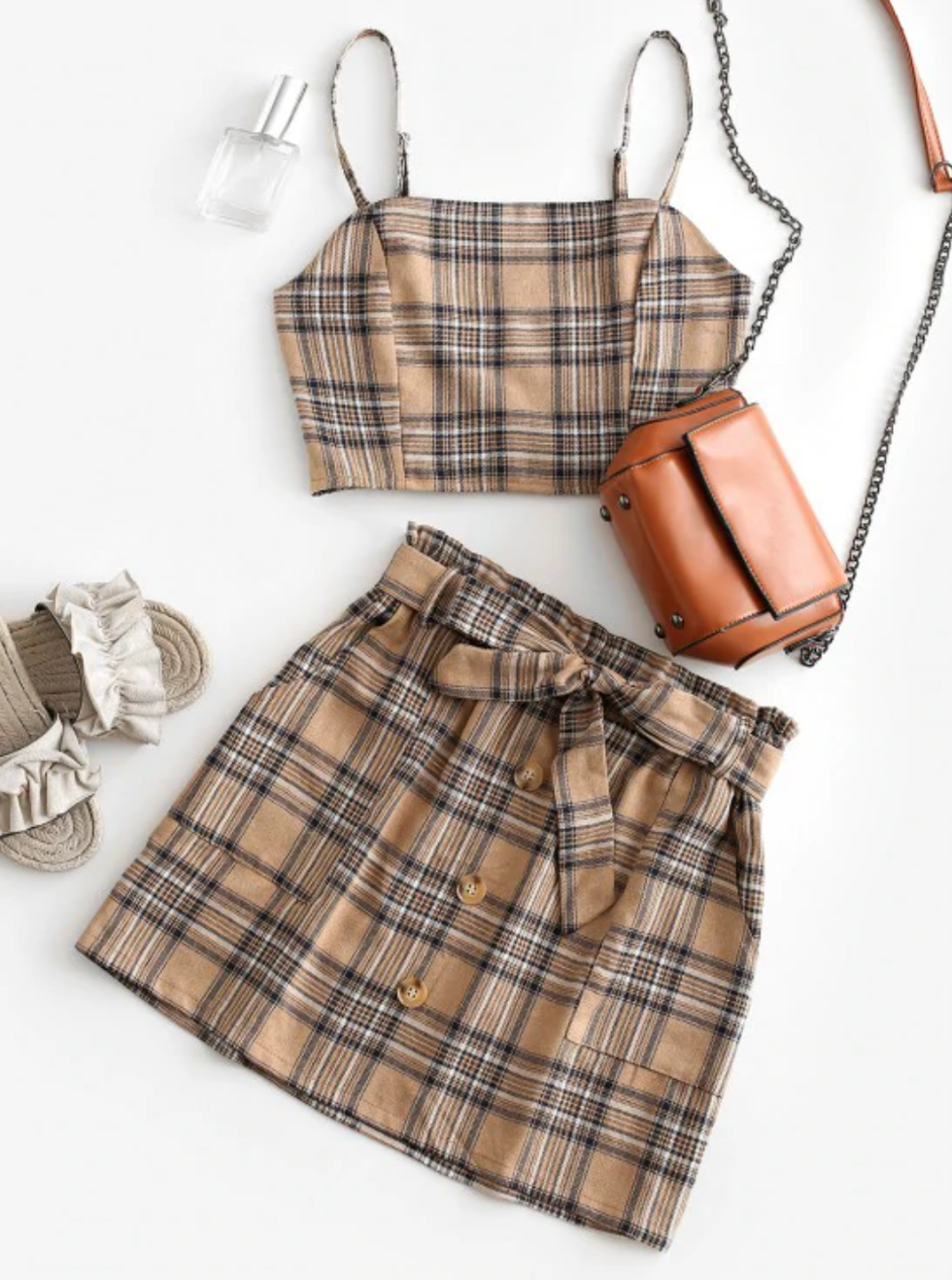 Details: Neutral-tone plaids are a staple going into the fall season and this set gives us major Clueless vibes. Cher would be proud.