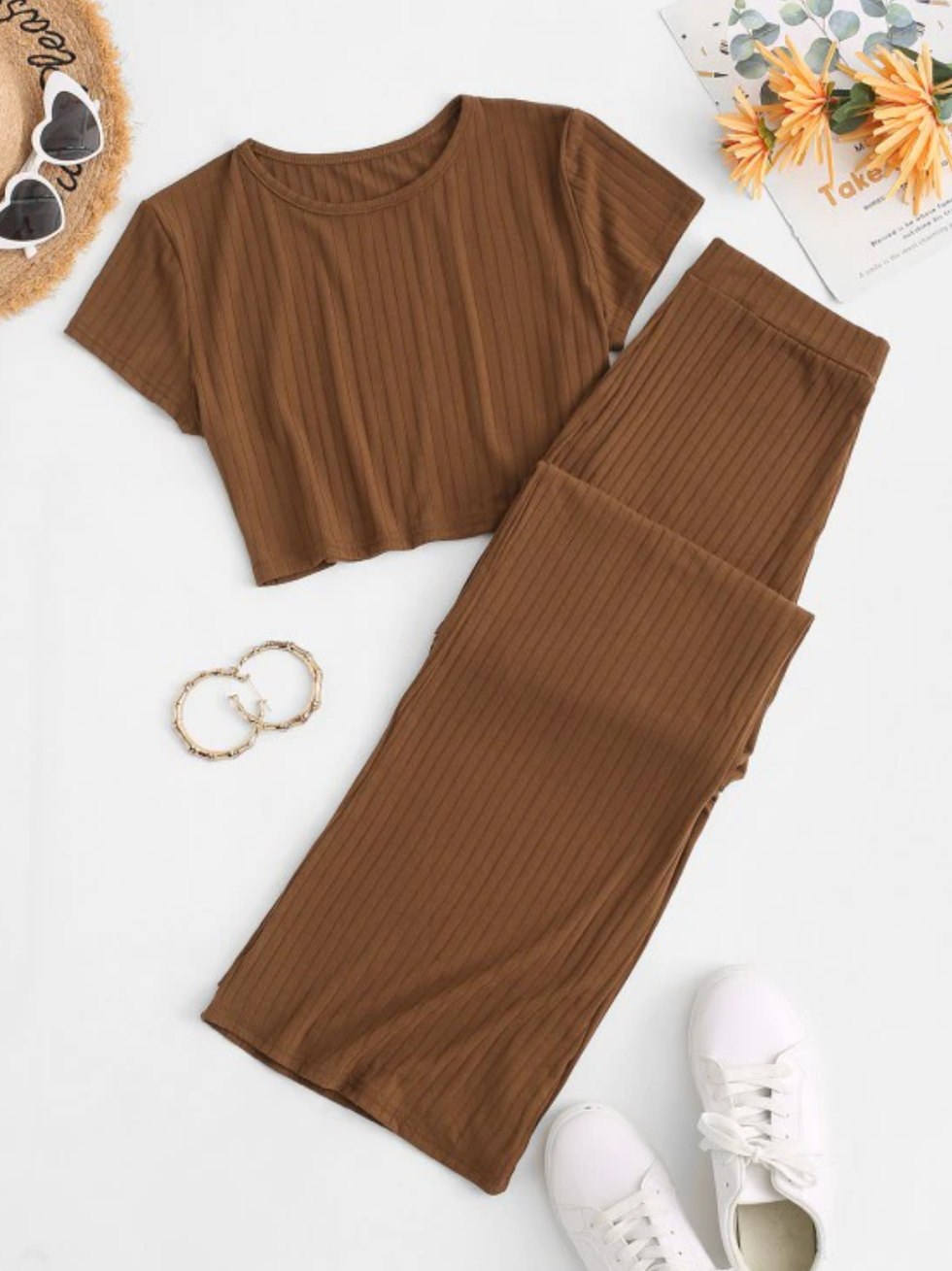 Ribbed Cap Sleeve Top & Wide Leg Pants Set