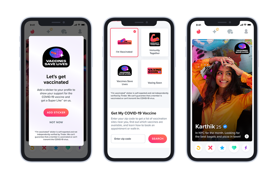 Several online dating apps are hooking up with the White House in the States to offer perks for their users. Tinder, for instance, lets users add vaccination stickers to their profile and will give them a free super-like as well.