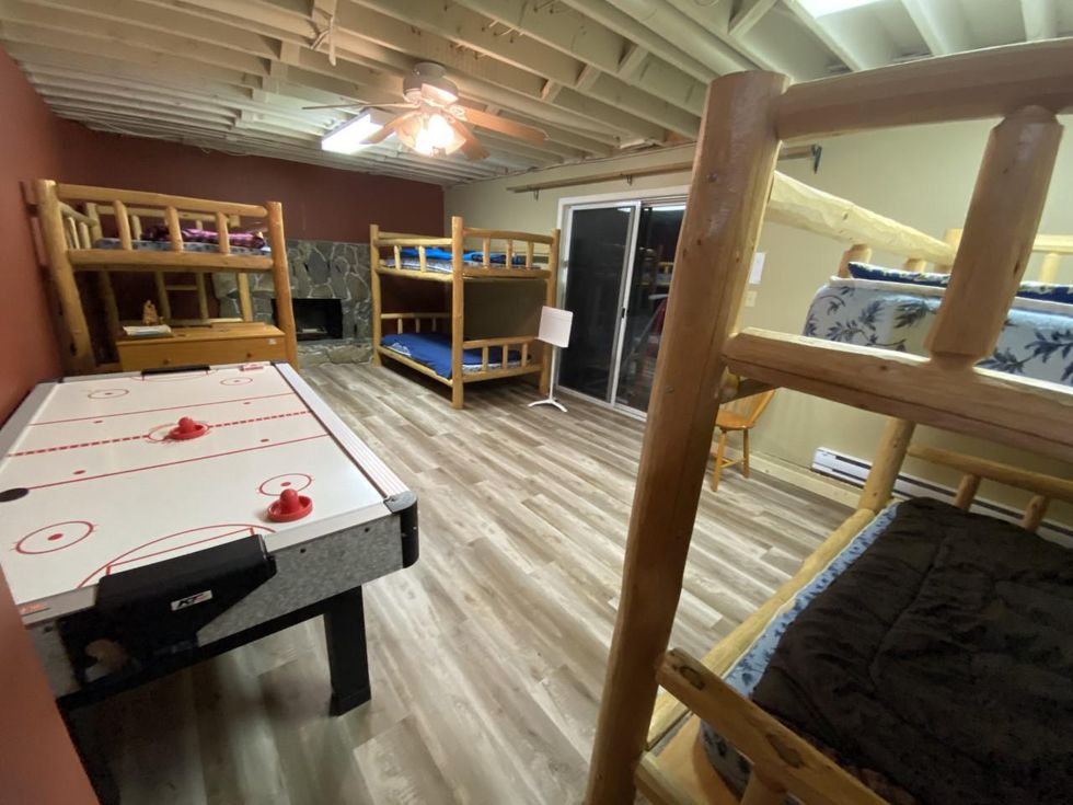 The inside of the home is spacious and cozy. It has a classic cabin feel with four bedrooms, two fireplaces, and three bathrooms.