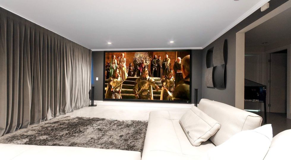 It has a games room, a wet bar for mixing cocktails, a home gym, and a theatre room.