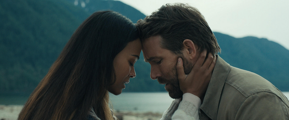 Ryan Reynolds and Zoe Saldana embrace each other. Right: Ryan Reynolds and Walker Scobell looking up.