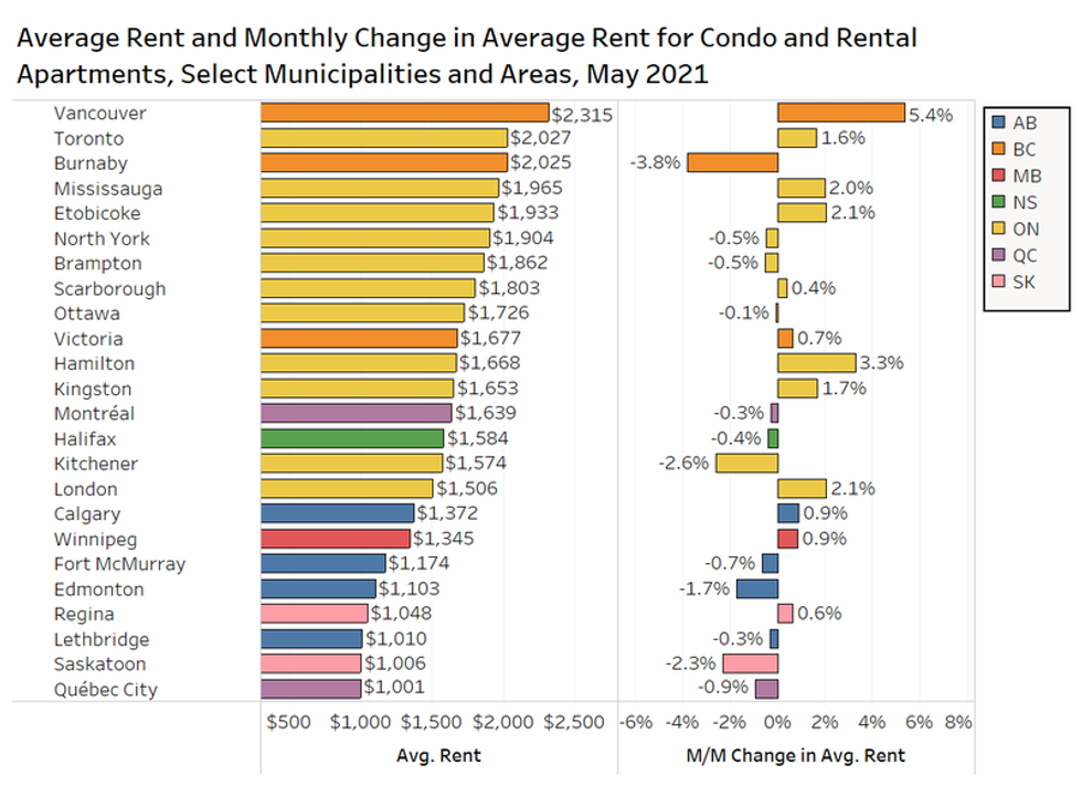 "Vancouver experienced the largest month-over-month increase among the major municipalities with a monthly increase of 5.4% in average rent to $2,315, the highest in the country," said the report.