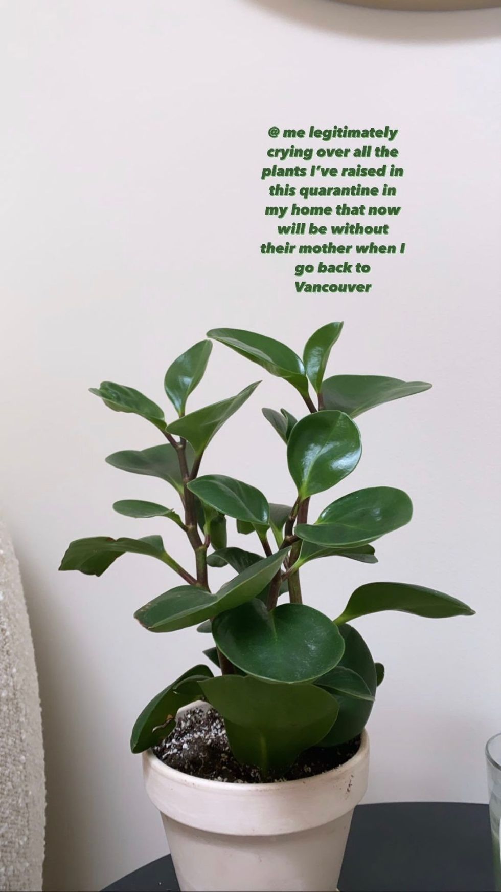 "@ me legitimately crying over all the plants I’ve raised in this quarantine in my home that now will be without their mother when I go back to Vancouver," she wrote alongside a photo of her plant.