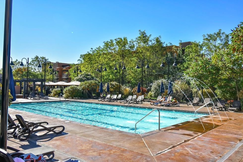 There are also four restaurants, a pool, and a hot tub nearby. The pool is open year-round and even comes with a water slide.