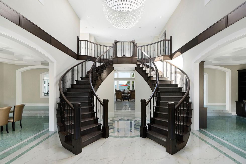 A massive entryway with a double staircase holds a custom Austrian crystal chandelier, which hangs from a 20-foot ceiling.