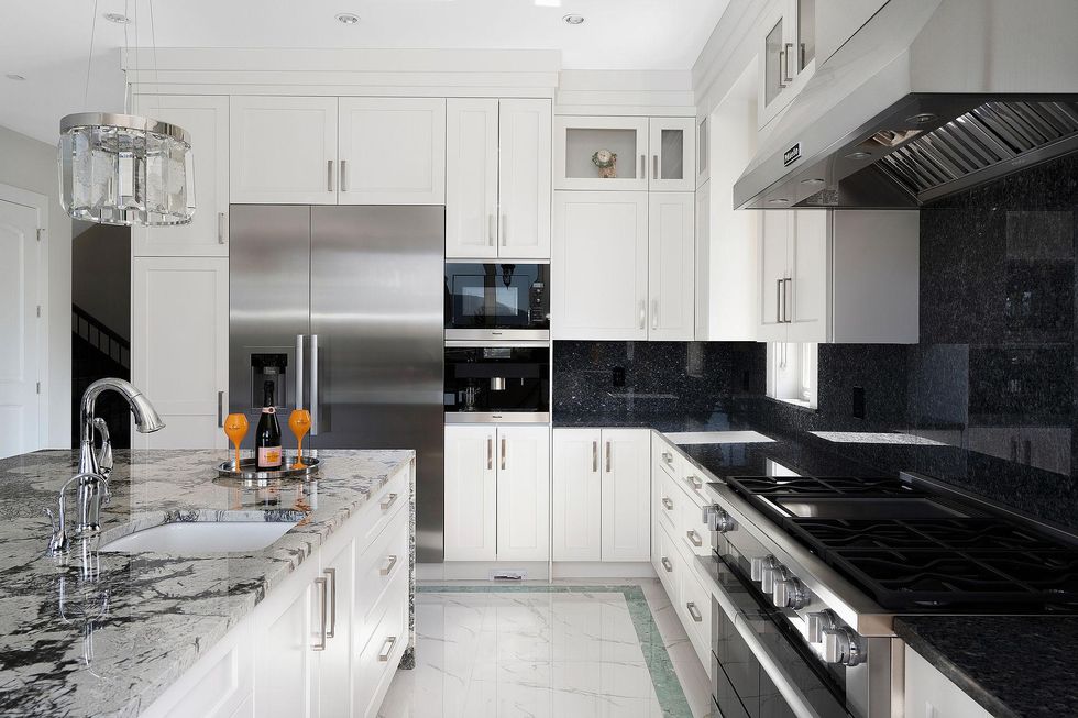 The modern kitchen has custom Italian imported counters and a beautiful island.