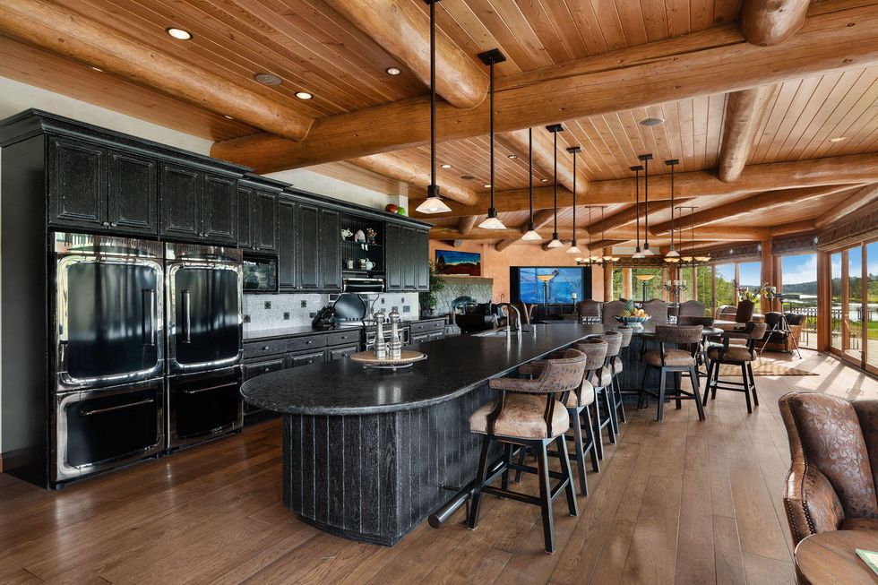 The custom dark wood kitchen with granite countertops is massive and surrounded by beautiful french doors. It also has a unique country aesthetic to it, with modern touches throughout.