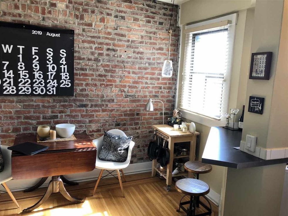 The 1920s structure has plenty of charming details, like exposed brick walls, wood floors, large windows with lots of natural light, and updated kitchens.