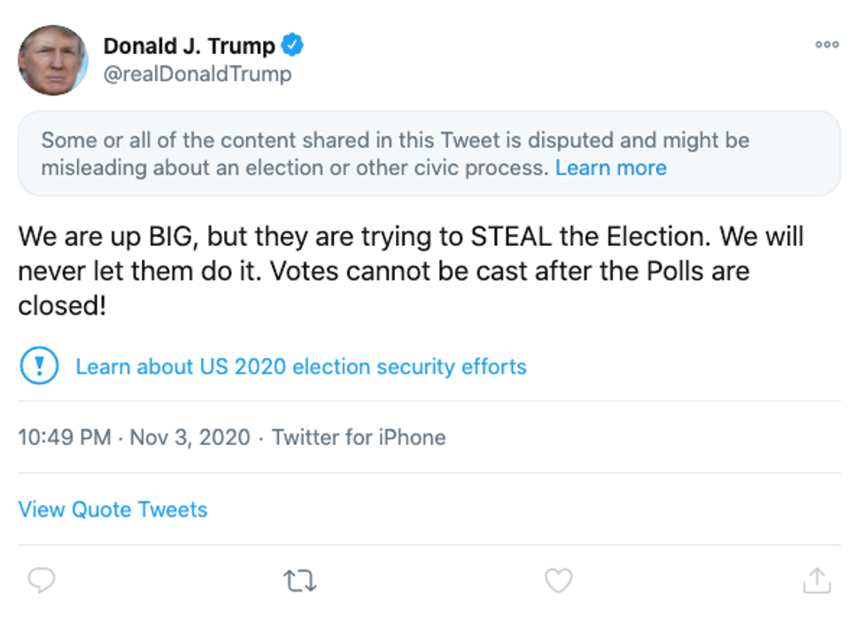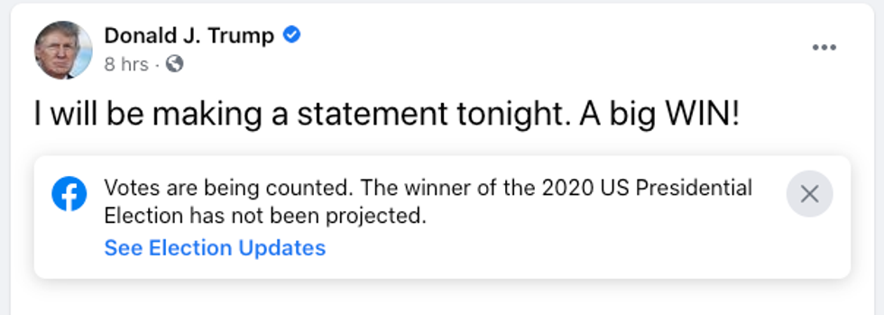 Trump was posting in the wee hours of the morning, claiming to have won the election. Below such posts, the social media platforms added disclaimers stating "Votes are being counted. The winner of the 2020 US Presidential Election has not been projected," for example.