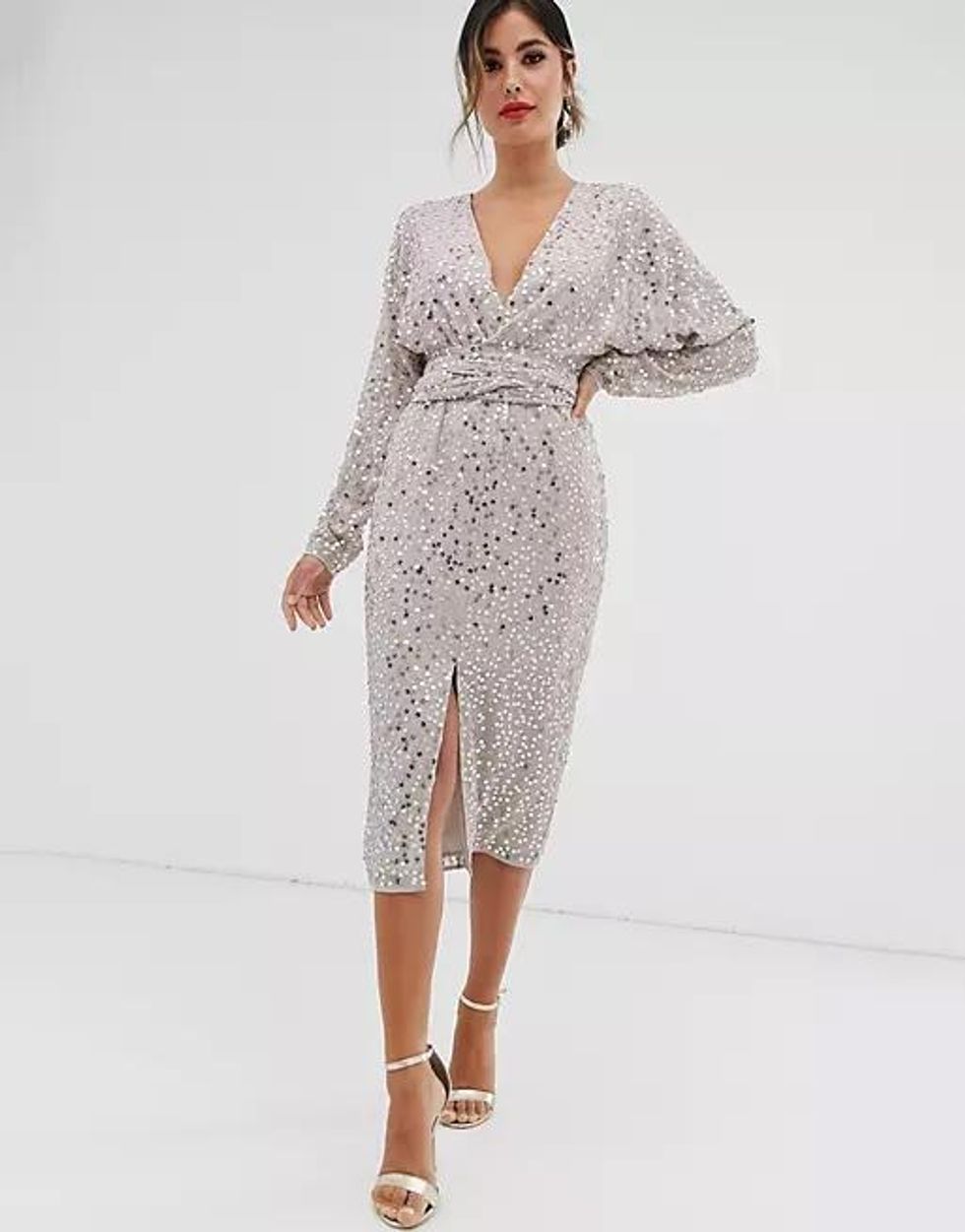 Details: If you want a little sparkle while attending your best friend's wedding, this pale gold number is picture-perfect. It has a bit of a plunging neckline, batwing sleeves and a tie waist. When in doubt, go all out.