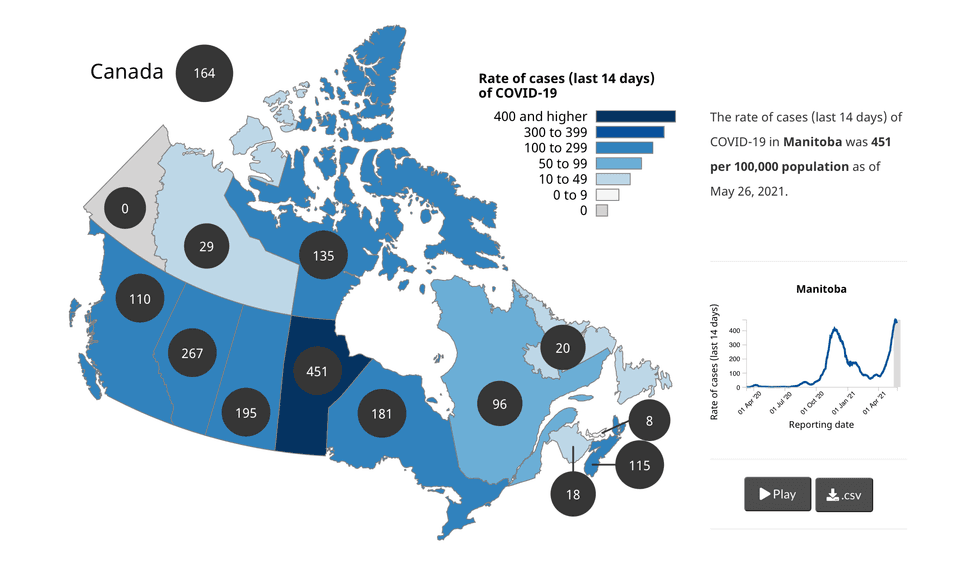 Figures shared by the Government of Canada on May 26 show that over the last two weeks, Manitoba has reported an average rate of 451 cases per 100,000 population.